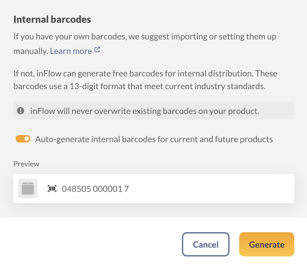 - Toggle ON Auto-generate internal barcodes for current and future products.
