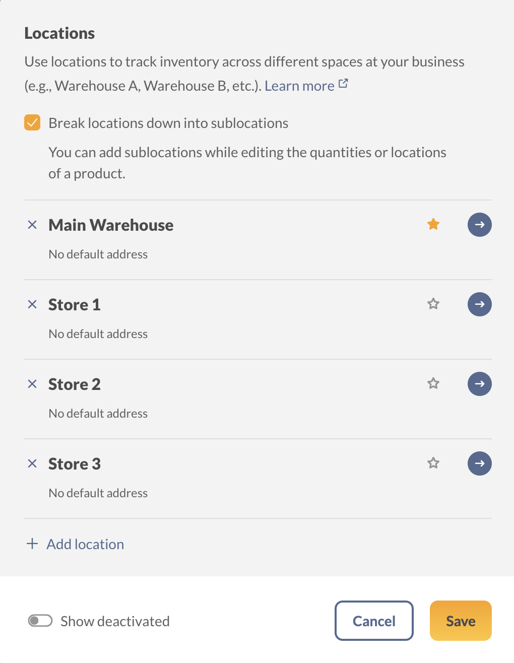 You can add sublocations to your main locations to represent rooms, aisles, shelves, or even bins in your building. To learn more, read this article on tracking inventory in sublocations.