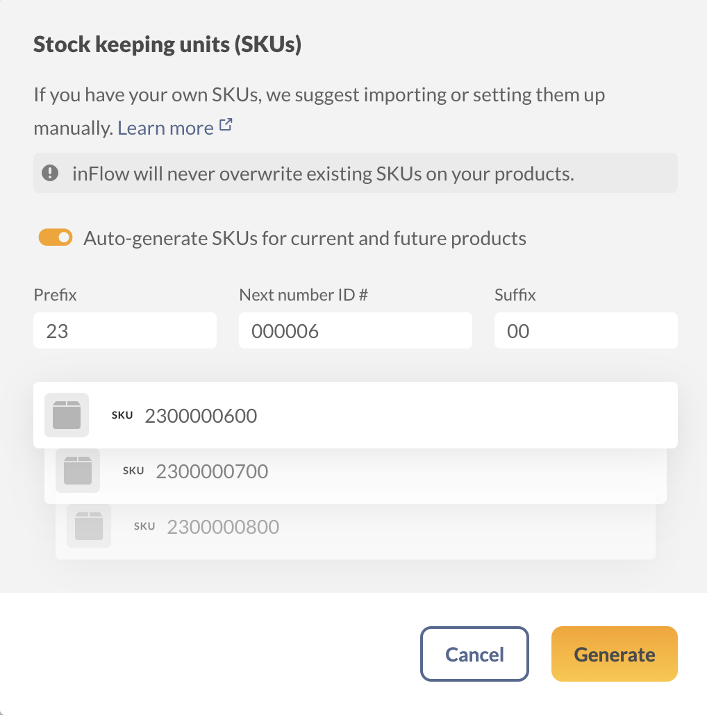 - You can set a Prefix, Next number ID#, and Suffix for inFlow to use when generating SKUs.