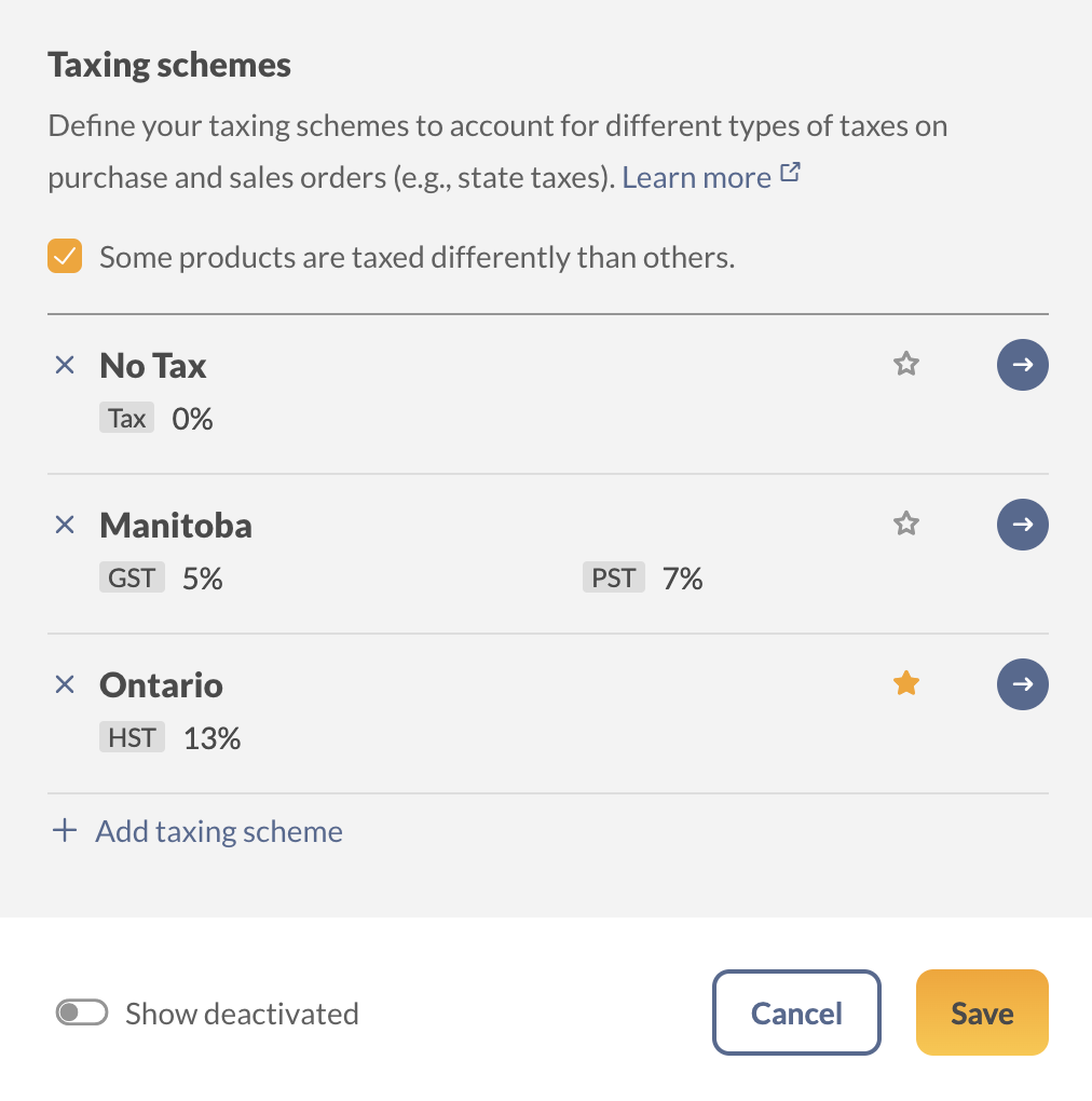 - You can add more taxes by clicking on the Add taxing scheme button at the lower left-hand corner of the tax screen.