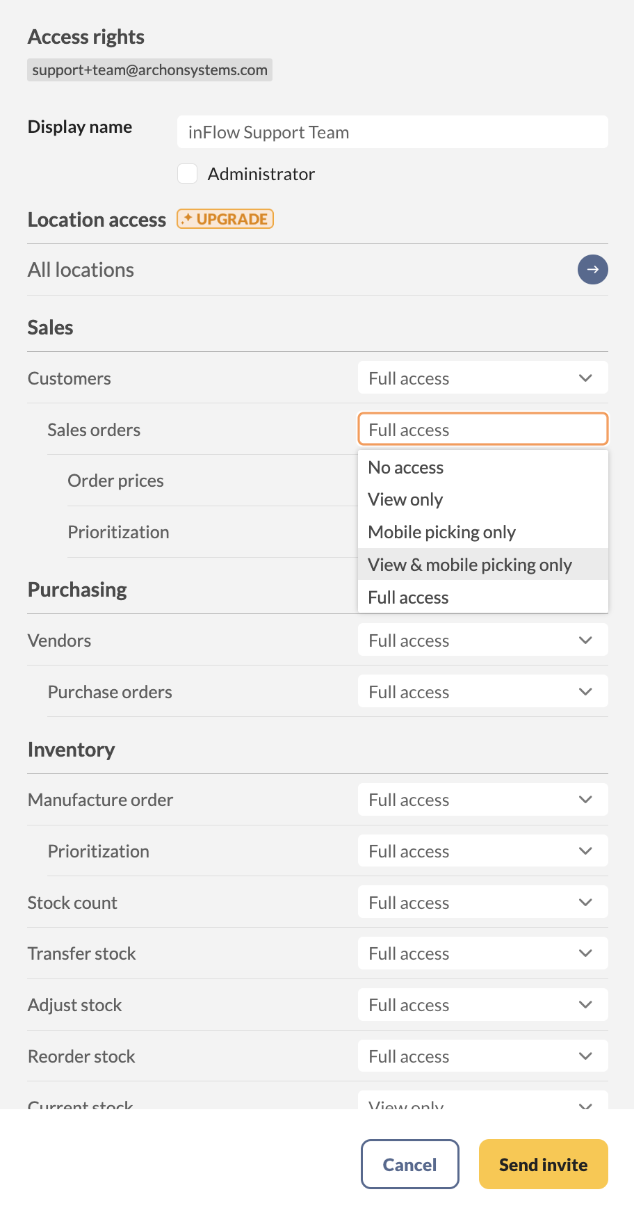 - On this page, you can edit the team member’s access rights for inFlow before you send the invitation.