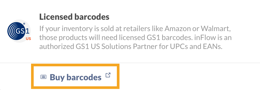 For more details, check out the GS1 Barcode Shop or select Buy barcodes from the Inventory settings in inFlow.