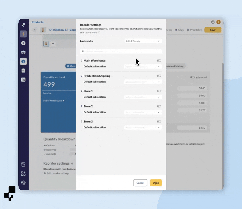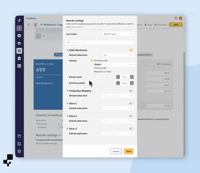 Use inFlow’s product reordering settings to keep your inventory organized and ensure you always have enough stock.