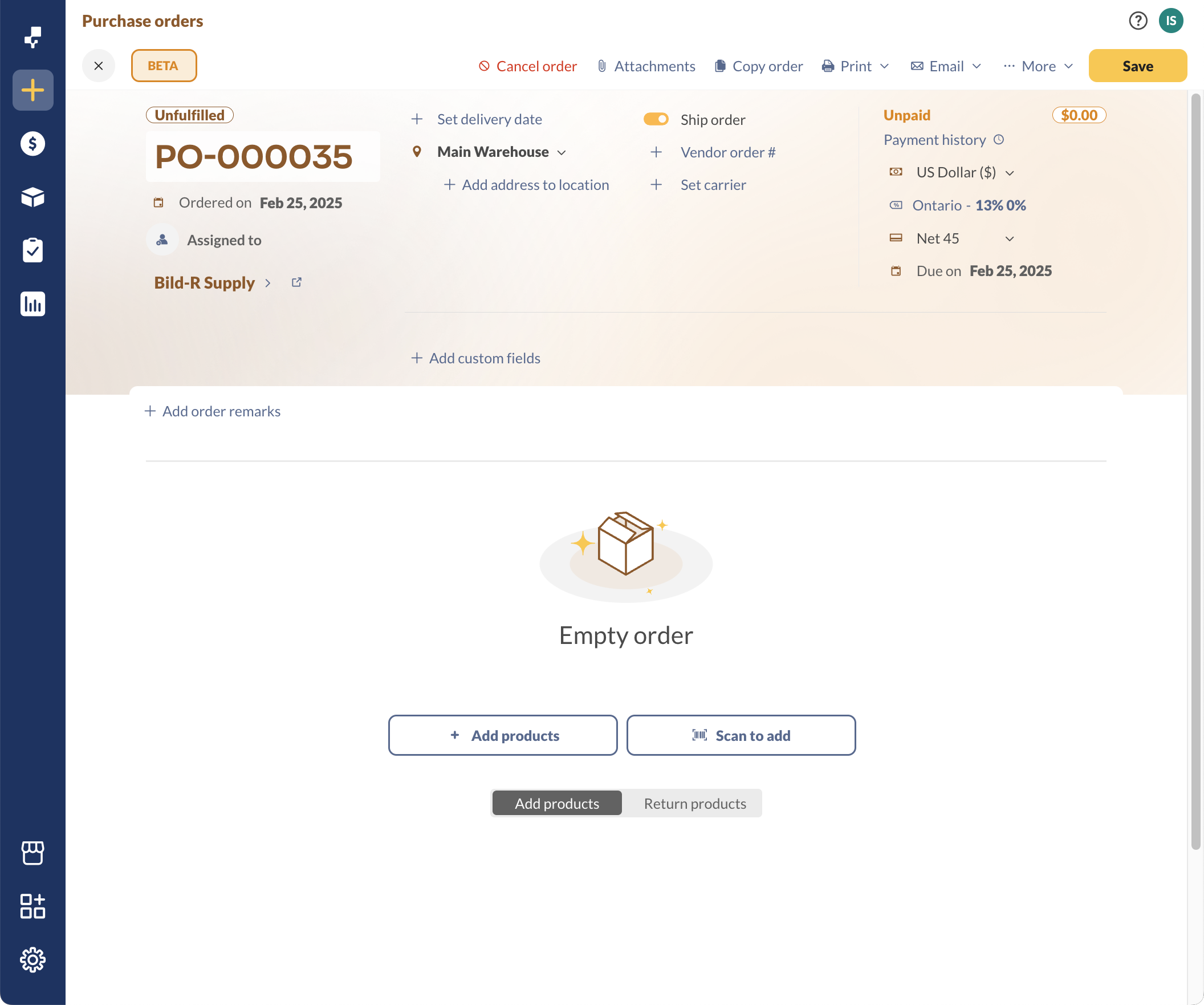 The product table is where you’ll add the products you are ordering or returning to your vendor.