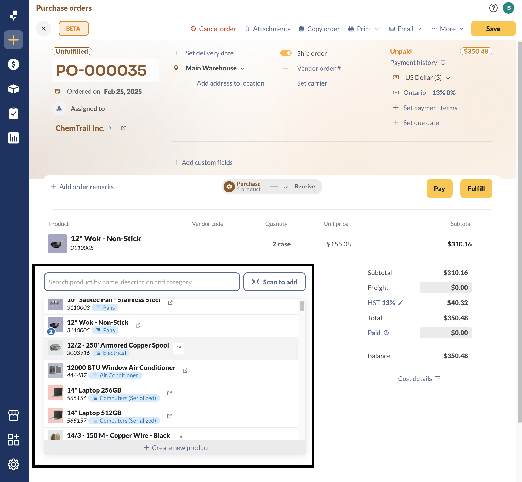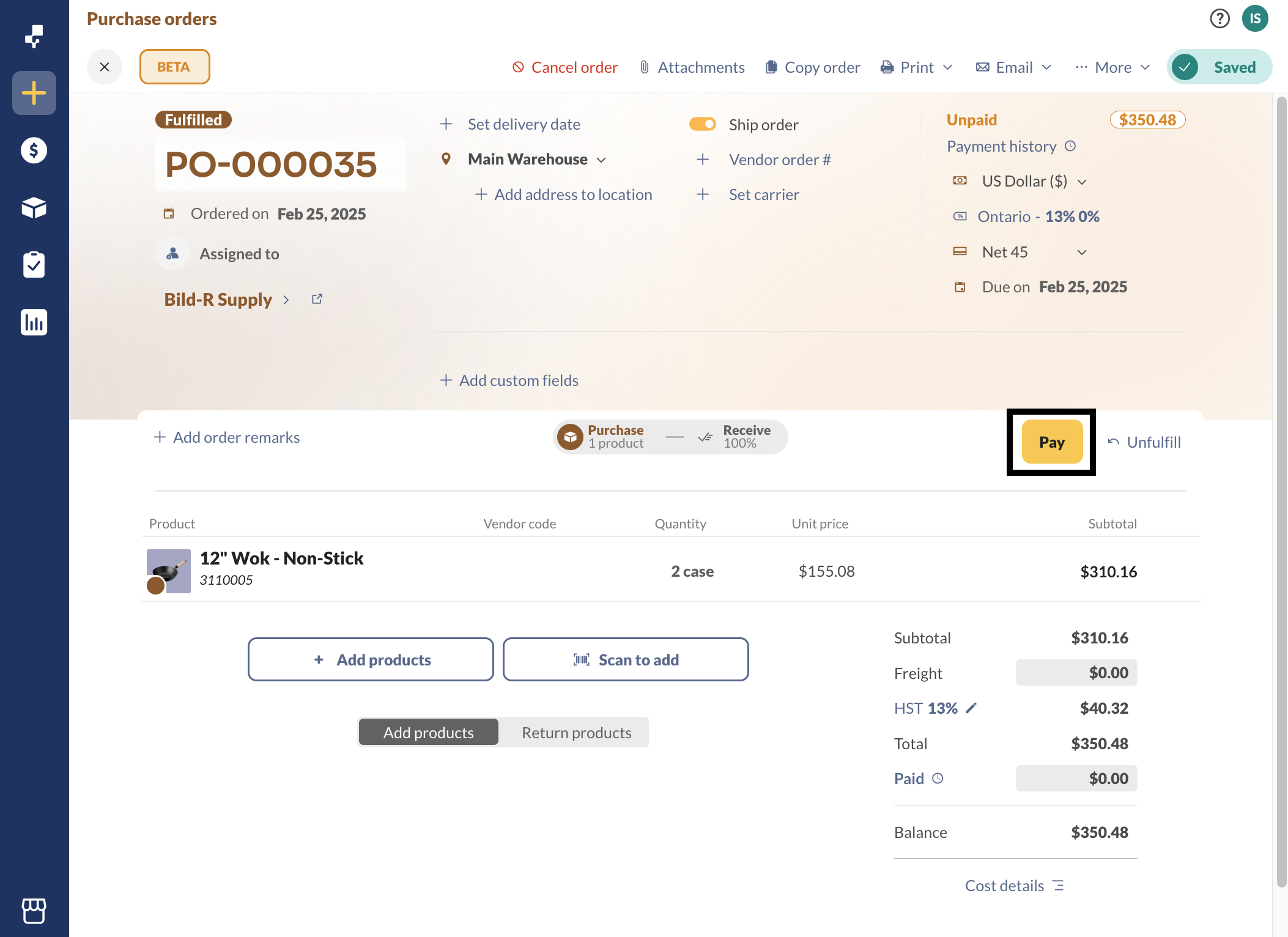 Click the “Pay” and “Fulfill” buttons to complete your purchase order.