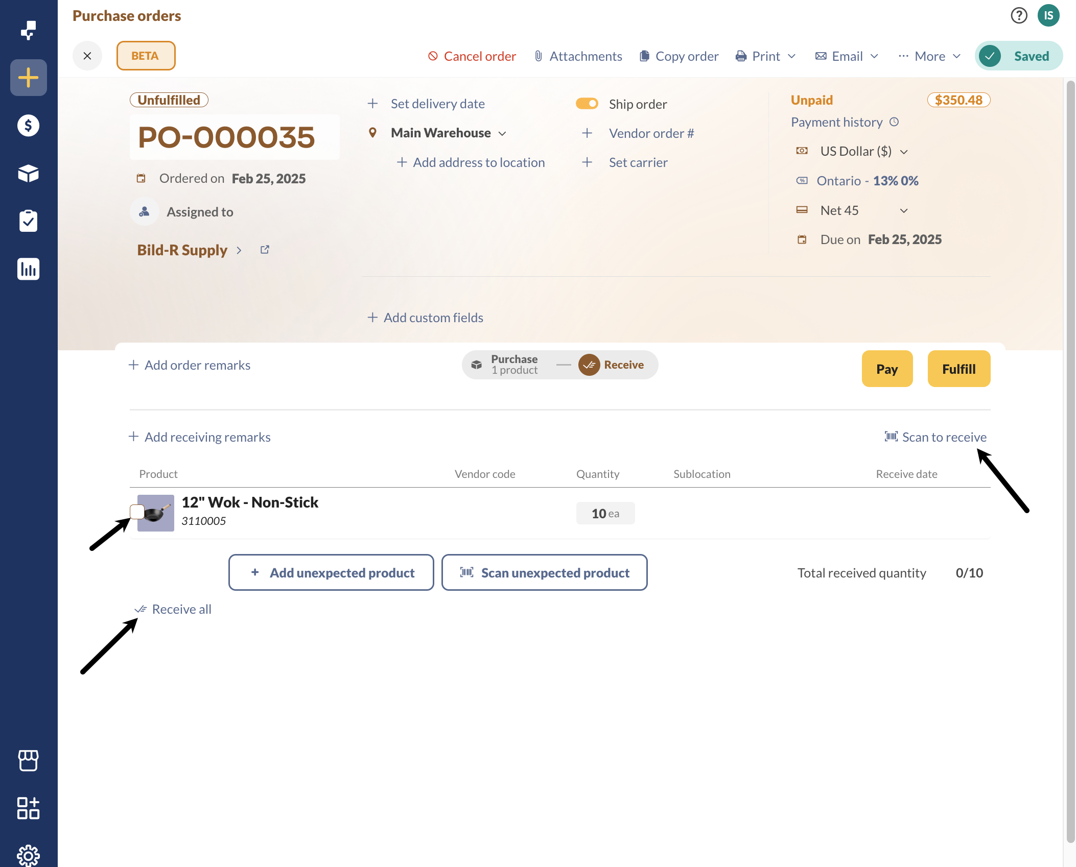 - If you are using a barcode scanner, click Scan to receive. Otherwise, check off the products on the table to partially receive or select Receive all.